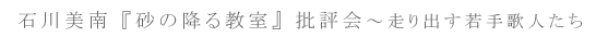 昨年出版された石川美南歌集『砂の降る教室』を読むと共に、 2〜30代の若手歌人の作品を考える熱い会にしていきたいと思います。皆様どうぞご参加ください。 【日時】 2004年9月4日(土) 午後1時〜5時〈開場12時半〉 【会場】東京芸術劇場 大会議室(池袋駅西口から徒歩5分) http://www.geigeki.jp/access.html 第1部 若手歌人の歌を読む ○パネルディスカッション 水原紫苑 永井祐 西之原一貴 佐藤りえ 黒瀬珂瀾(司会) ○作品朗読 斉藤齋藤 中島裕介 永田紅 橋元優歩 第2部 石川美南『砂の降る教室』批評会 ○パネルディスカッション 岡井隆 川野里子 田中庸介 穂村弘 藤原龍一郎(司会) ○『砂の降る教室』を語る 荻原裕幸 石川美南 総合司会 千葉聡 (敬称略) 終了後、懇親会を行ないます。お気軽にご参加ください。 (懇親会会場:「サンチェーロ」 豊島区池袋2-1-1 フォーアイズ千野ビル2階 http://r.gnavi.co.jp/g136910/map1.htm ) |